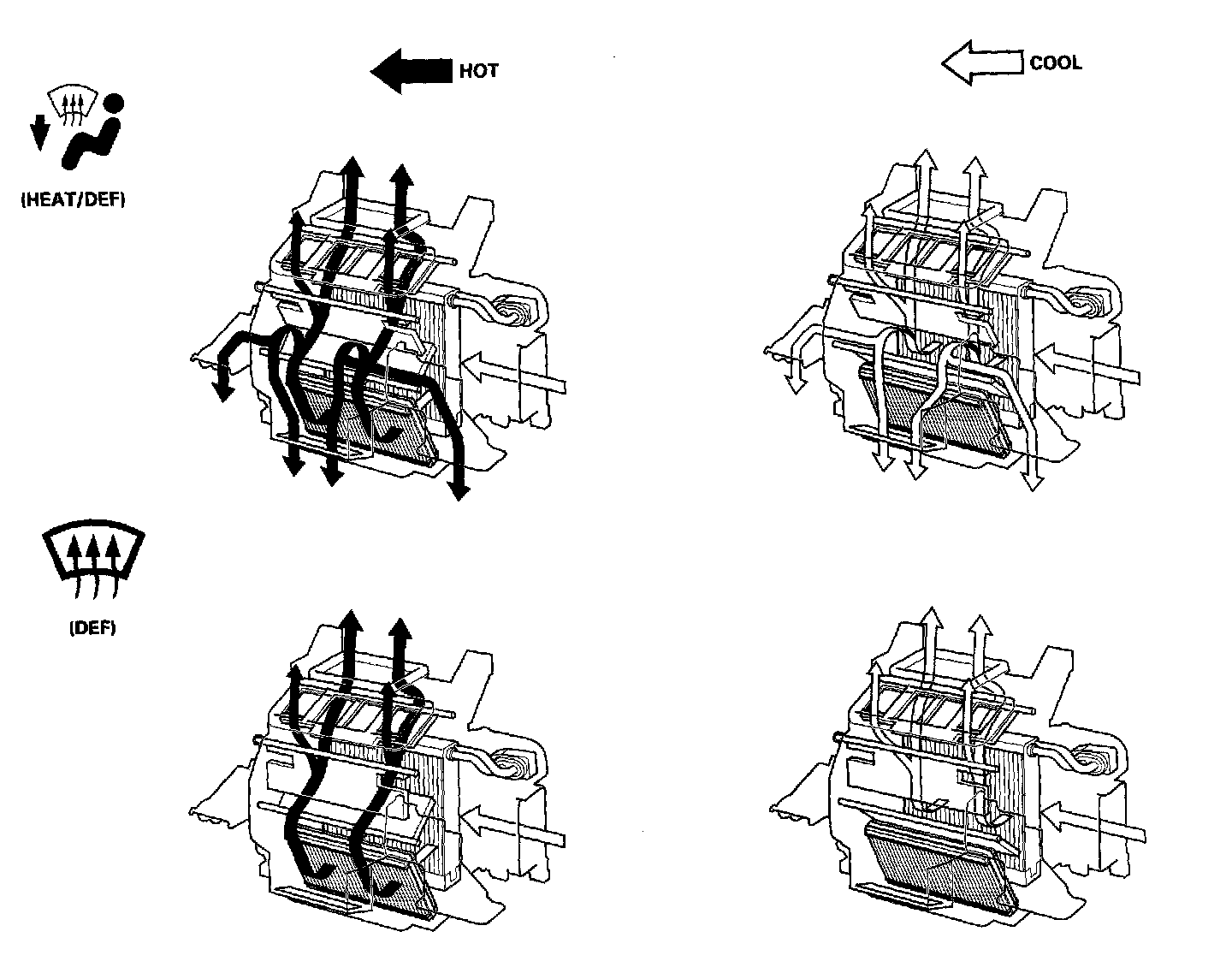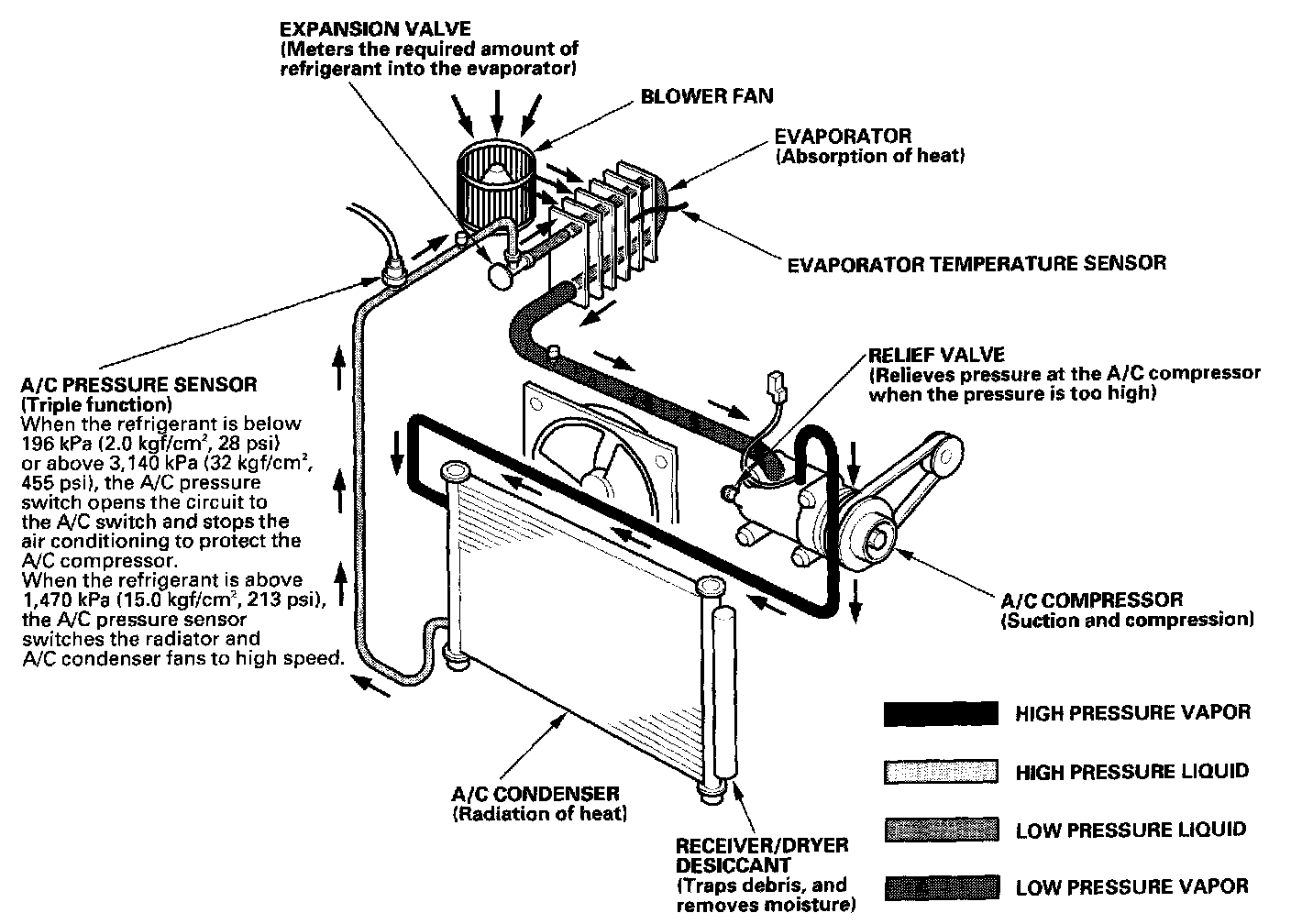 System DescriptionThe air conditioning system removes heat from the passenger compartment by circulating refrigerant through the system.