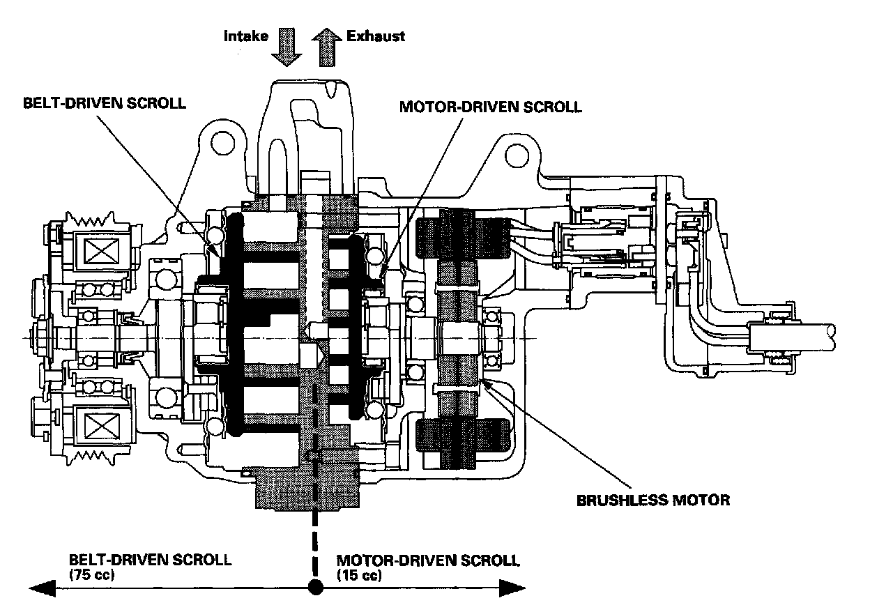 The dual scroll hybrid compressor is a twin chamber, dual compressor, that can use both mechanical (belt-driven) and electric power (motor-driven) to compress refrigerant.