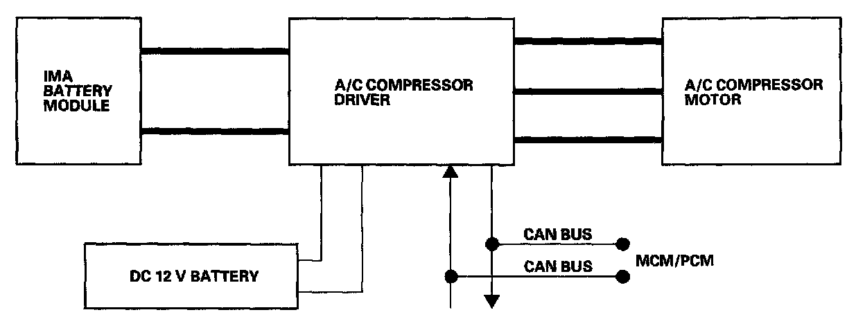 The A/C compressor driver supplies the A/C motor compressor with switched high voltage from the IMA battery module. The A/C compressor driver receives rotation rate signals from the MCM/PCM and HVAC climate control panel through a CAN Bus to meet the driving conditions and cooling request. In case of a system failure the A/C compressor driver will communicate a DTC through the CAN Bus. The DTC is displayed through the HVAC and/or IMA system depending on the failure.