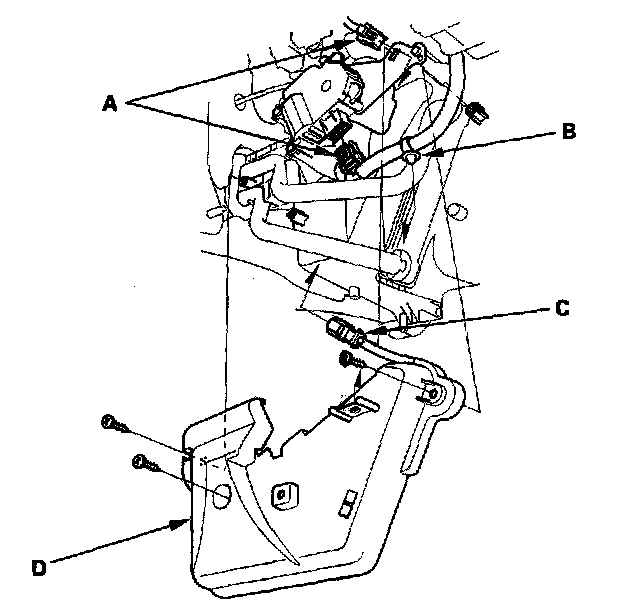 4. Disconnect the connectors (A) from the air mix control motor and heater core temperature sensor, then remove the harness clip (B) and the connector clip (C). Remove the self-tapping screws and the heater core cover (D).