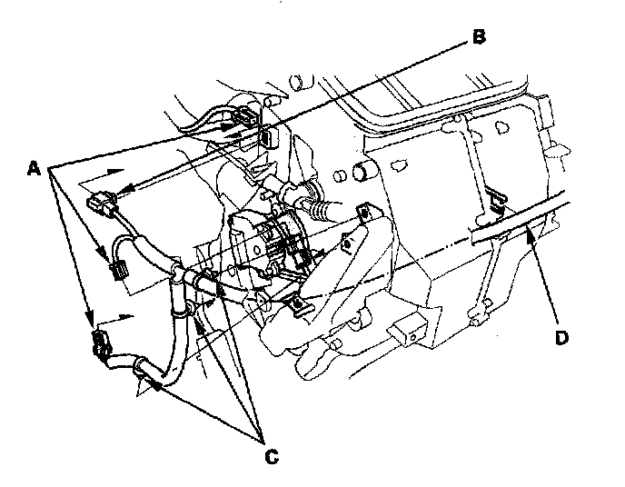13. Disconnect the connectors (A) from the air mix control motor, heater core temperature sensor, and A/C wire harness. Remove the connector clip (B), the wire harness clips (C), and the wire harness (D).