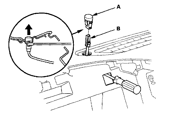 2. Remove the sunlight sensor (A) from the dashboard with a flat-tip screwdriver, then disconnect the connector (B). Be careful not to damage the sensor and the dashboard.