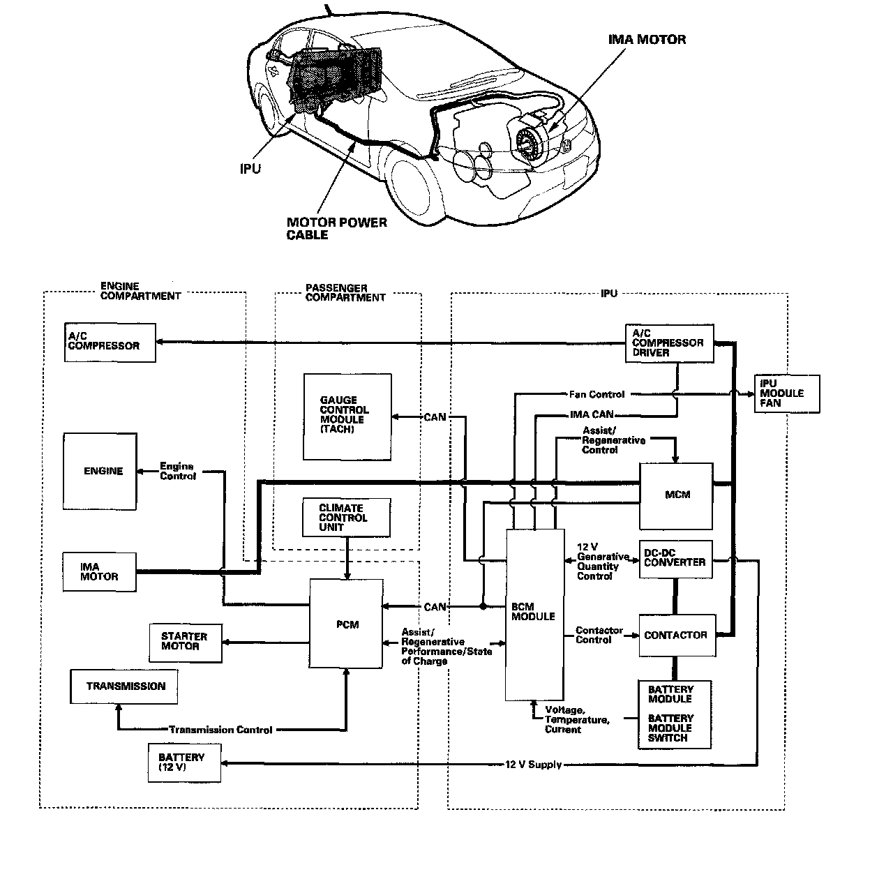 The IMA system contains the DC 158 V battery and AC synchronous motor, control system, and related accessories. For safety, the intelligent power unit (IPU) is located behind the rear seat.