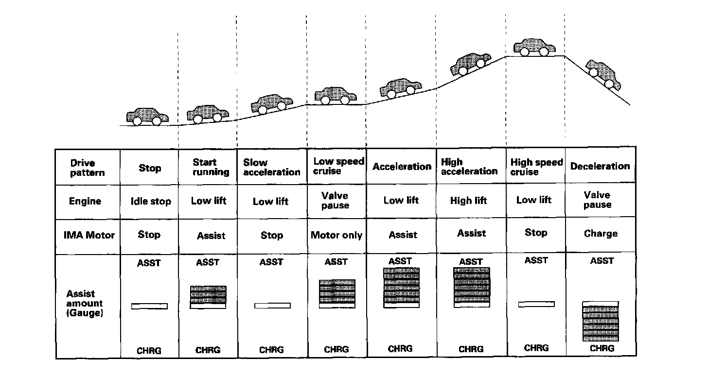 The IMA motor runs the vehicle by itself if the IMA battery has enough electricity left. The intake and exhaust valves pause to reduce valve spring compression and pumping loss.