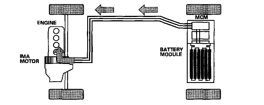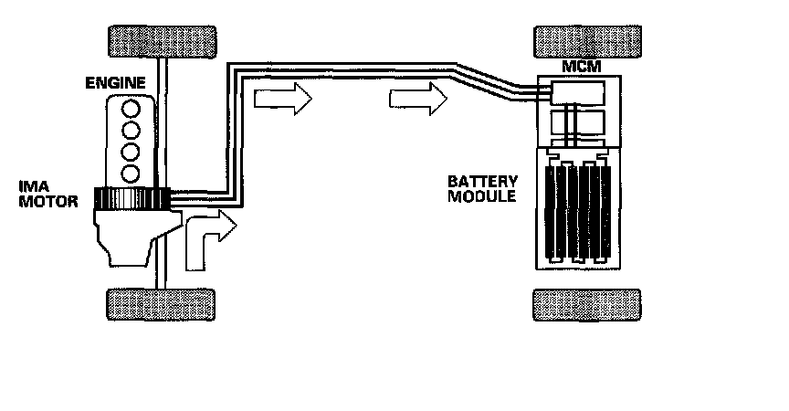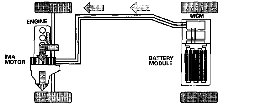 The IMA motor, directly connected to the engine crankshaft, functions as a generator during deceleration, an engine starter, and a motor to assist the engine that drives the wheels.