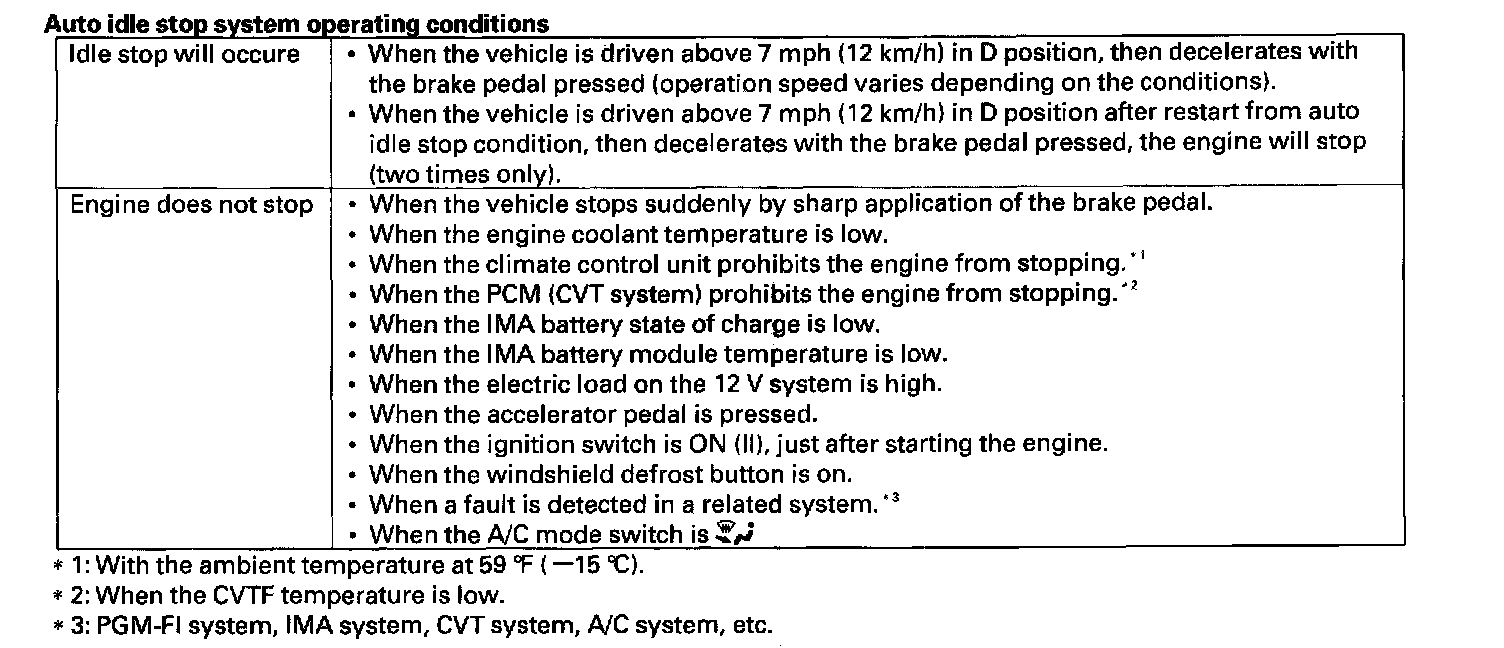 The auto idle stop system stops the engine automatically when the vehicle comes to a stop to reduce overall fuel consumption and minimize tailpipe emissions. When the following operating conditions are met, auto idle stop will occur.