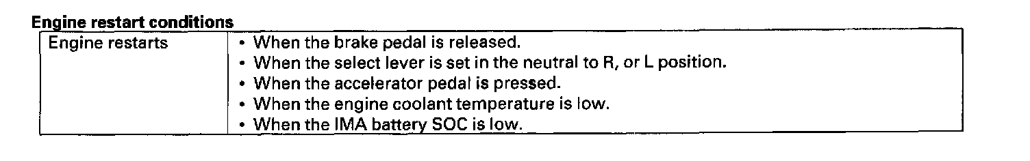 When the following engine restart conditions are met, the PCM restarts the engine by driving the IMA motor via the MCM and restarting fuel injection.