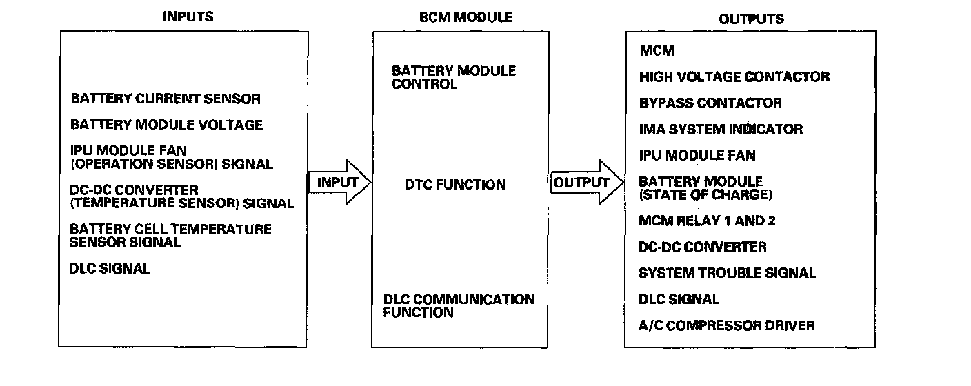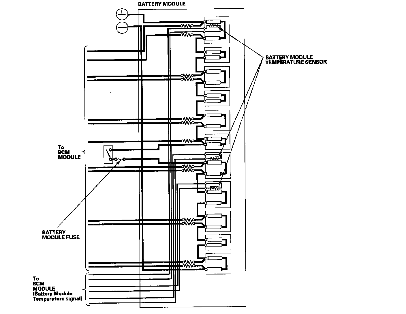The high voltage contactor and bypass contactor are connected at the negative (-) output side of battery module. These contactors are controlled by the BCM module, connecting the IMA battery to the high voltage circuits. The current flows through the bypass contactor and bypass resistor at start-up.