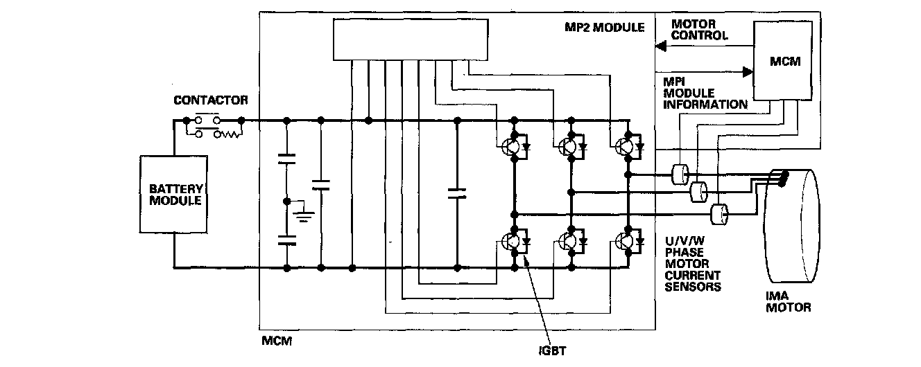 The MCM module controls the DC/AC conversion (from the IMA battery's 158 V DC to the IMA motor's 3-phase AC and vice versa).