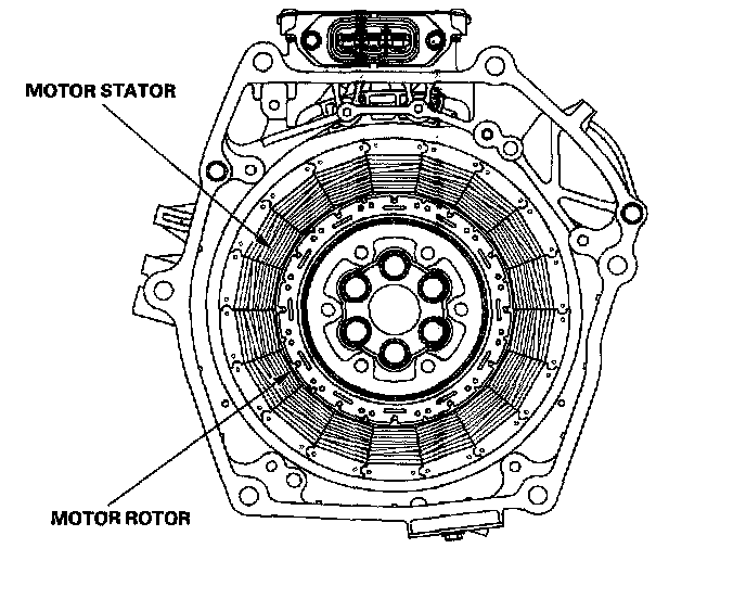 The motor is located between the engine and the transmission. It consists of a 3-phase coil stator and a permanent magnet rotor that is directly connected to the engine crankshaft. A motor rotor position sensor is mounted on the back of the engine block to detect the position of the rotor.