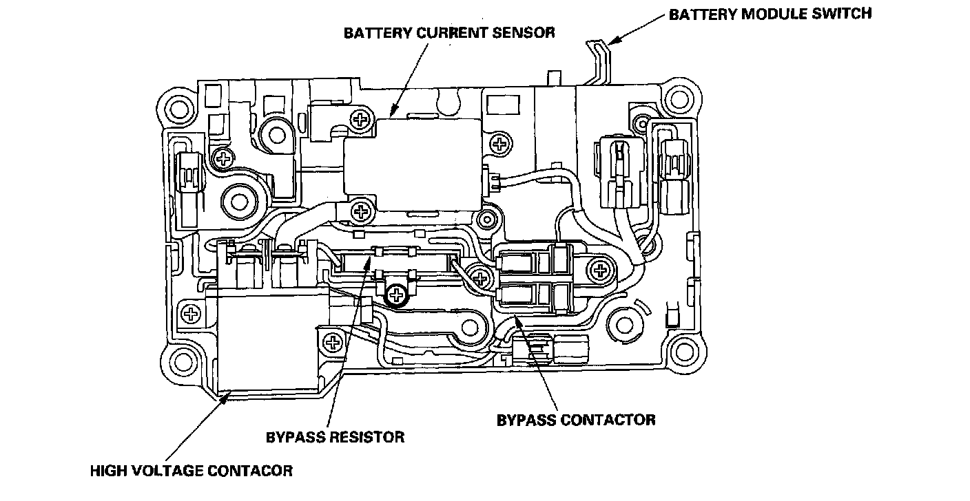 The junction board, mounted on the battery module, distributes high voltage energy to the IMA system. The contactors, bypass resistor, and the battery current sensor are all on the junction board.