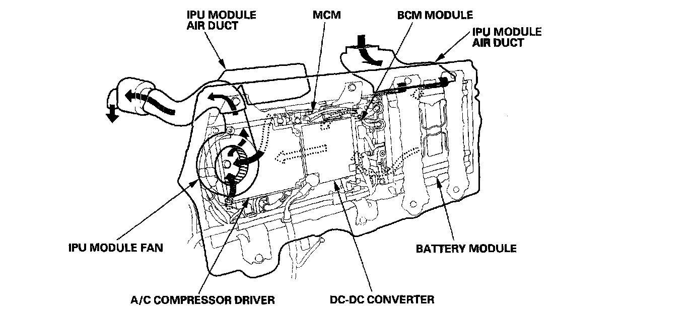 The battery module, the MCM, the A/C compressor driver, and the DC-DC converter generate heat during assist/regeneration. The IPU is equipped with a fan to cool it down, assure proper battery performance, and protect the system. The fan has a control circuit and rotation sensor that are controlled by the BCM module. The cooling air is drawn into the battery module from the top of the rear tray, then it is exhausted into the trunk compartment and outside of vehicle through the MCM heat sink, the DC-DC converter, and A/C compressor driver heat sink.
