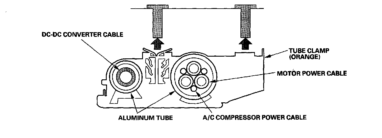 The IMA motor power cable connects the IMA motor and the motor control module (MCM). The cable feeds through an aluminum tube for damage protection and to prevent noise. The A/C compressor power cable also goes through the aluminum tube. Another aluminum tube, parallel to the IMA motor/A/C compressor tube, houses the DC/DC converter cable. These pipes are connected in one piece with the pipe clamp (orange), and attached under the vehicle.