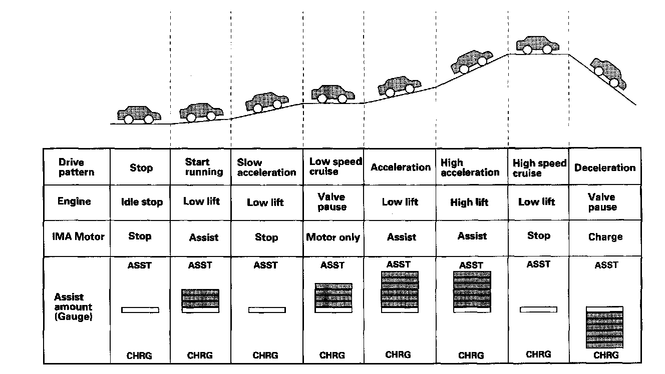 The IMA motor runs the vehicle by itself if the IMA battery is sufficiently charged. The intake and exhaust valves pause to reduce valve spring compression and pumping loss.