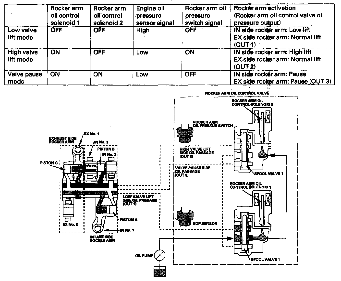 3 Stage i-VTEC SystemThe 3 stage i-VTEC system changes the intake valve lift (low lift, high lift, pause) and exhaust valve lift (normal lift. pause) characteristics to improve.fuel economy and power output. There are two rocker arm oil control solenoids in this system to control the engine oil passage that leads to the intake and exhaust rocker arms and controls the intake and the exhaust valve lift. The engine oil pressure is monitored with the engine oil pressure sensor and the rocker arm oil pressure switch.