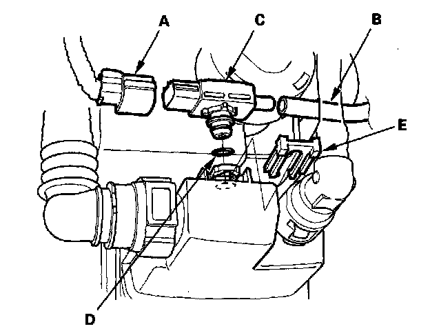 4. Install the sensor in the reverse order of removal with a new O-ring (D) and retainer (E).