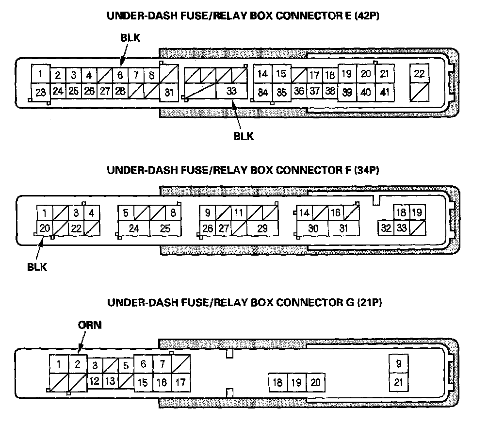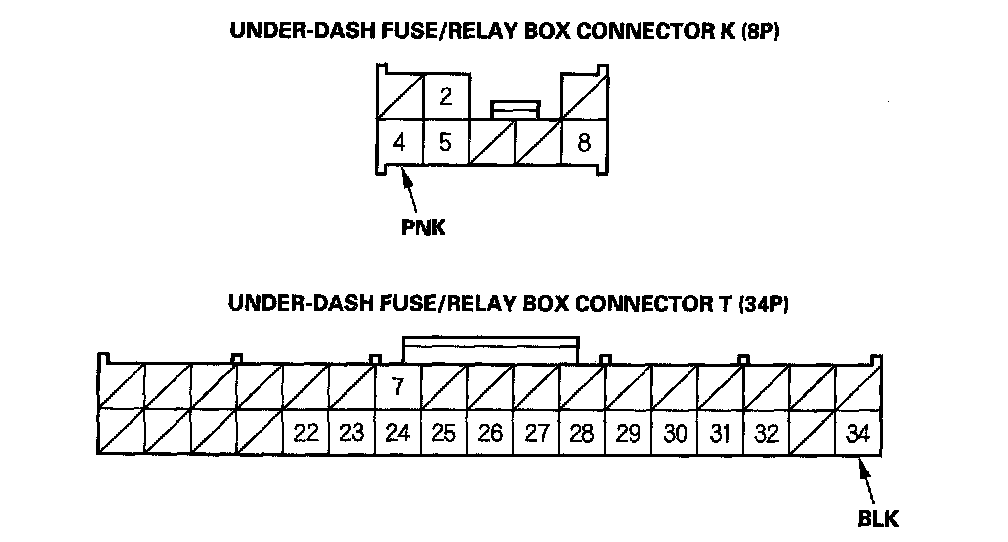 3. Disconnect the under-dash fuse/relay box connectors E, F, G, K, and T.