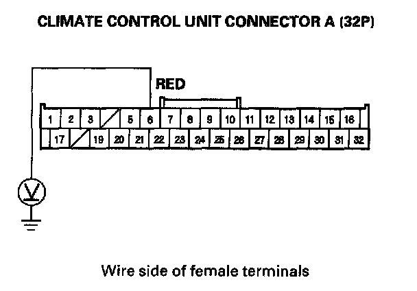 18. Measure the voltage between climate control unit connector A (32P) terminal No. 6 and body ground.