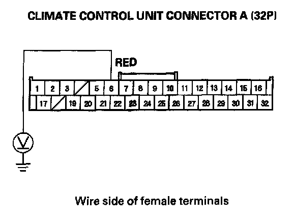 14. Measure the voltage between climate control unit connector A (32P) terminal No. 6 and body ground.