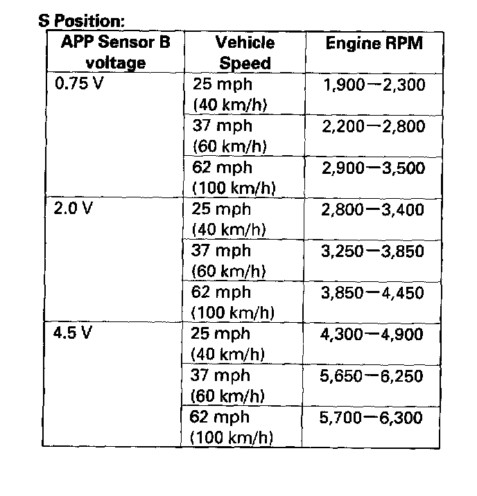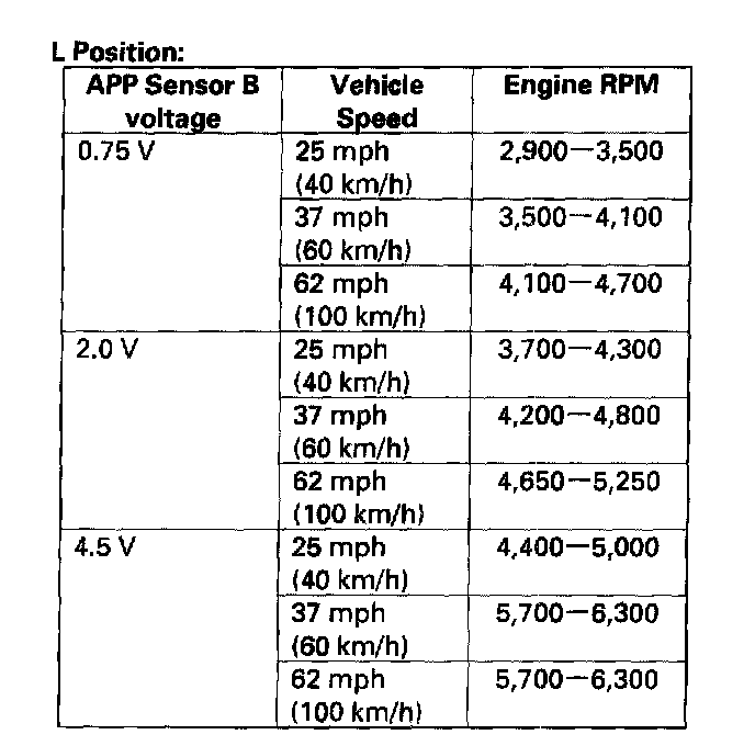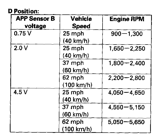 8. Monitor the HDS, and accelerate quickly until the APP Sensor B reads 0.75 V. Maintain a steady throttle until the vehicle reaches to reasonable speed, then slow the vehicle and come to a stop.