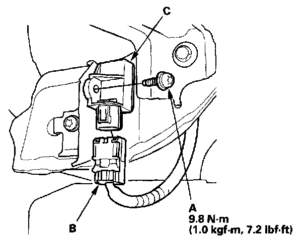 1. Install the new front impact sensor with a new Torx bolt (A), then connect the engine compartment wire harness 2P connector (B) to the front impact sensor (C).