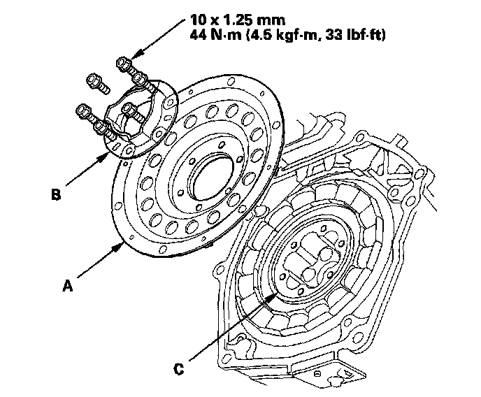 Drive PlateAttach the flywheel to the drive plate with six bolts. Rotate the crankshaft pulley to tighten the bolts to 1/2 of the specified torque, then to the final torque, in a crisscross pattern. After tightening the last bolt, check that the crankshaft rotates freely.