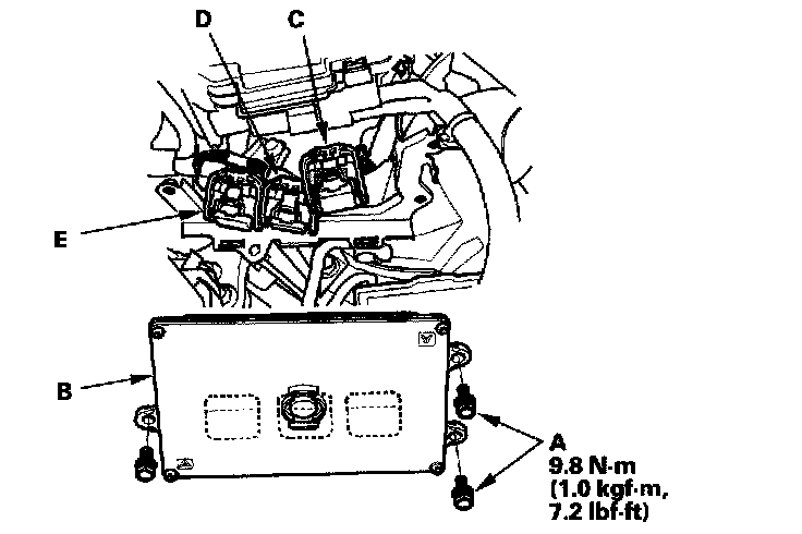 11. Disconnect the PCM connectors A (C), B (D), and C (E).
