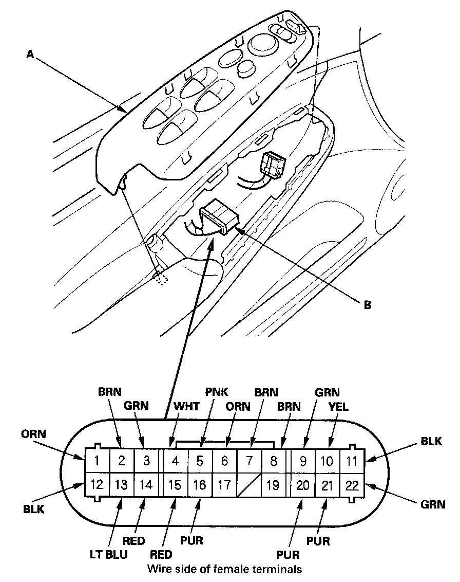 5. Reconnect the 22P connector to the power window master switch. Turn the ignition switch ON (II), and make these input tests at the connector.