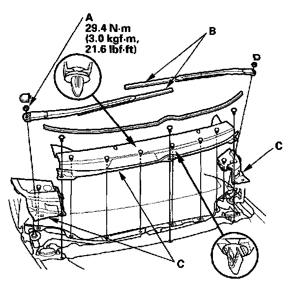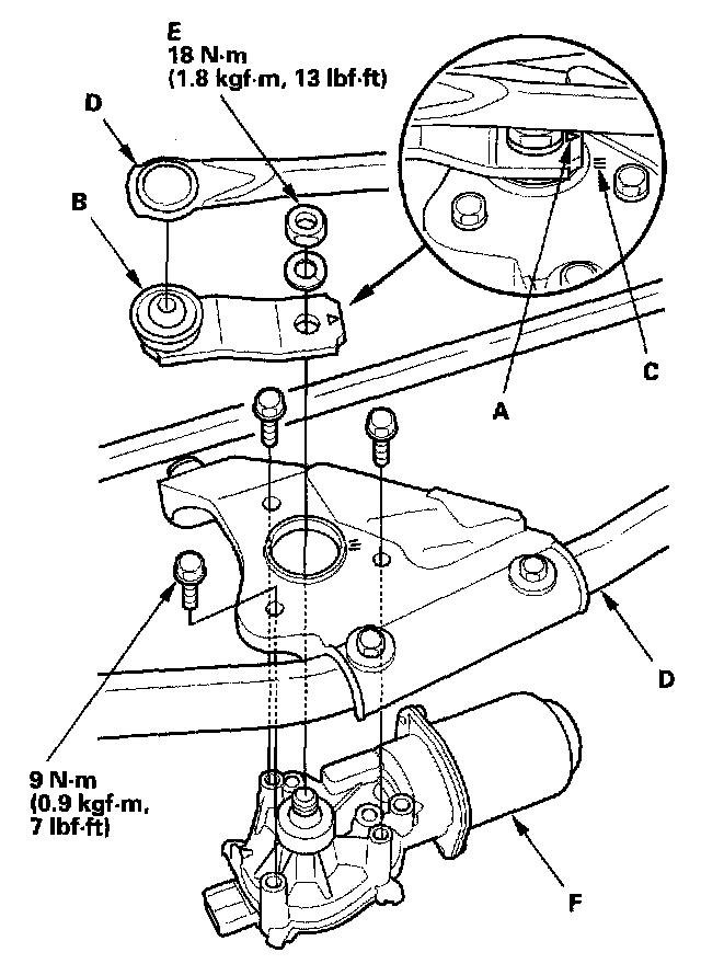 5. Make sure the mark (A) on the link (B) is aligned with the mark (C) on the windshield wiper linkage (D).