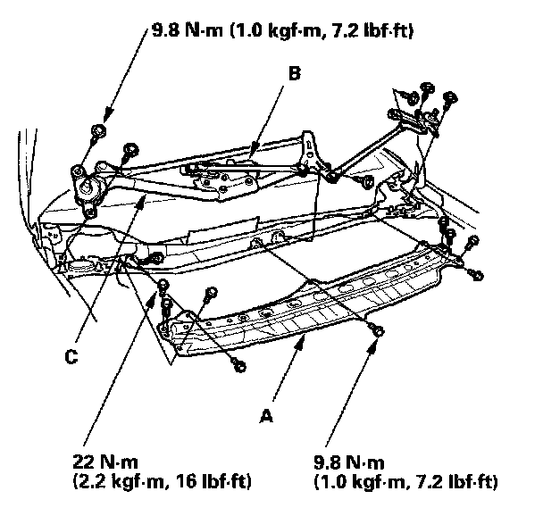 4. Disconnect the 5P connector from the wiper motor (B), then remove the six bolts and wiper linkage assembly (C).