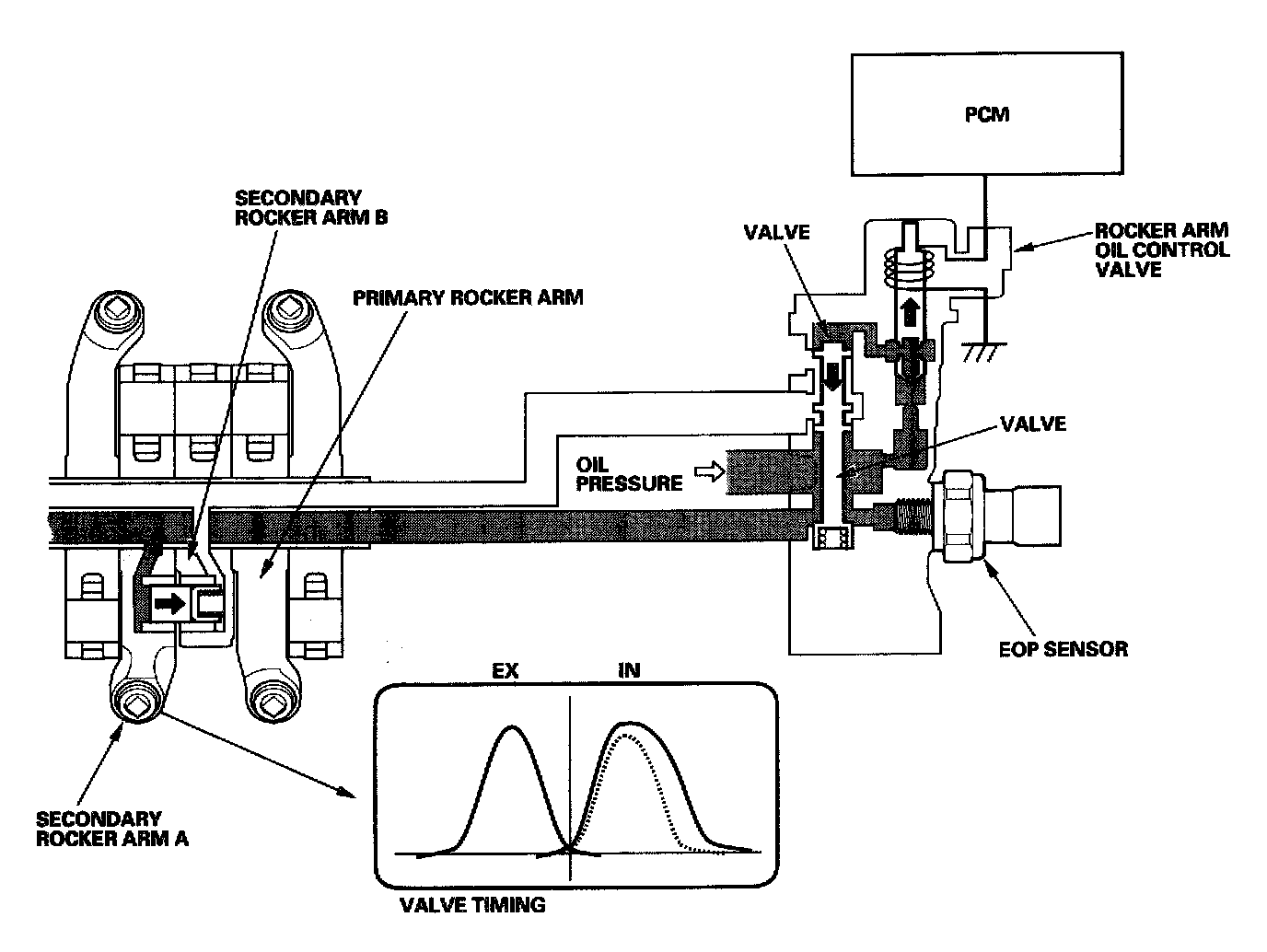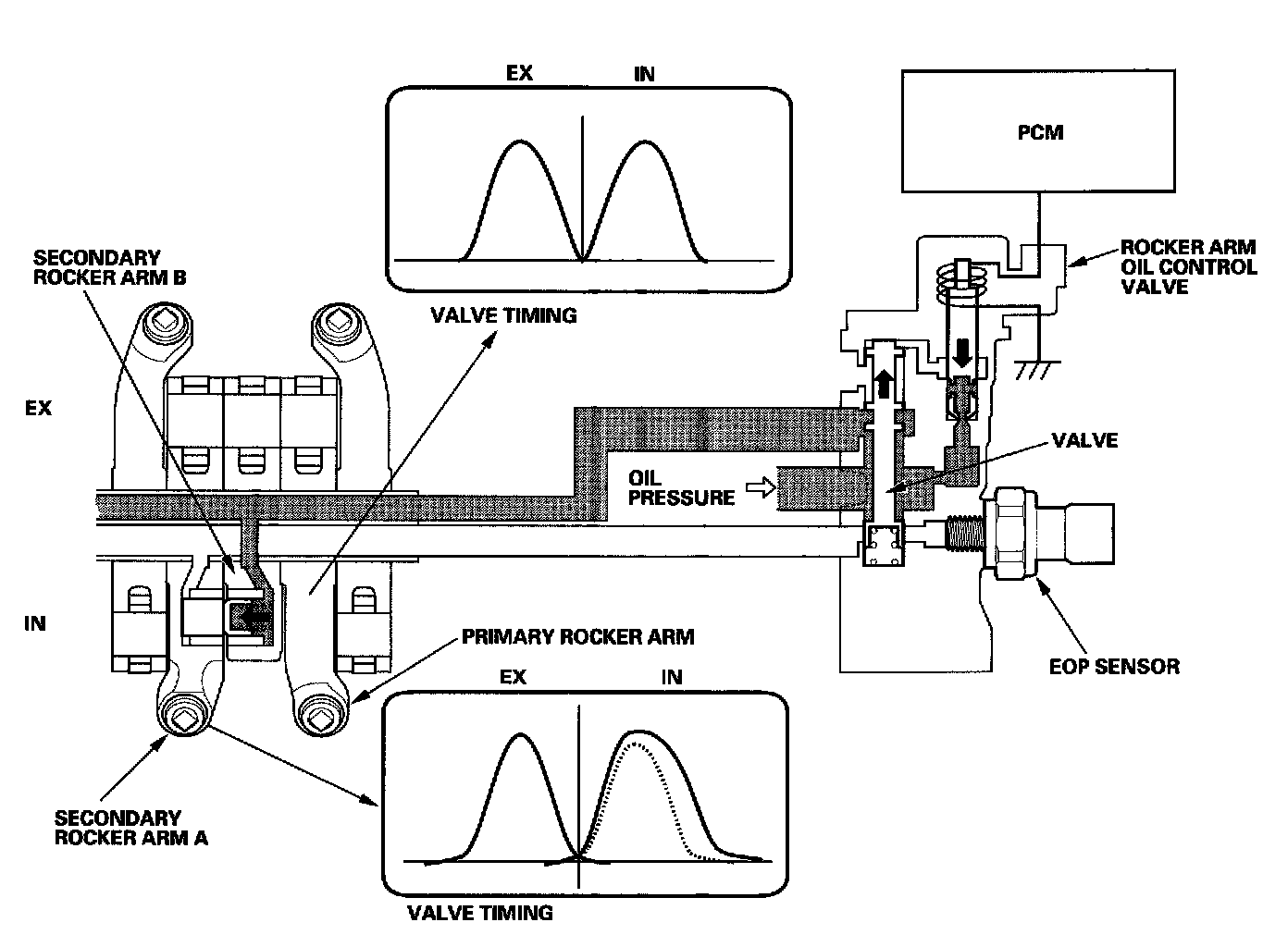 - Oil pressure enters secondary rocker arm B from the oil passage in the intake rocker shaft. This forces the VTEC switching piston into secondary rocker arm A against the return spring and disengages the secondary arm A from the secondary arm B to stop valve actuation.