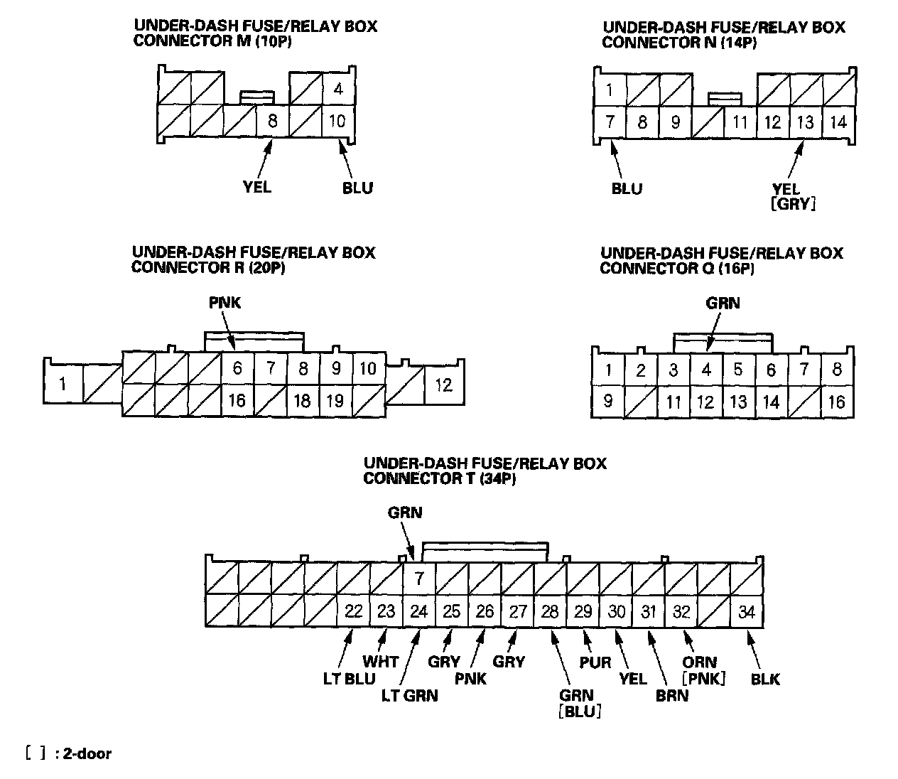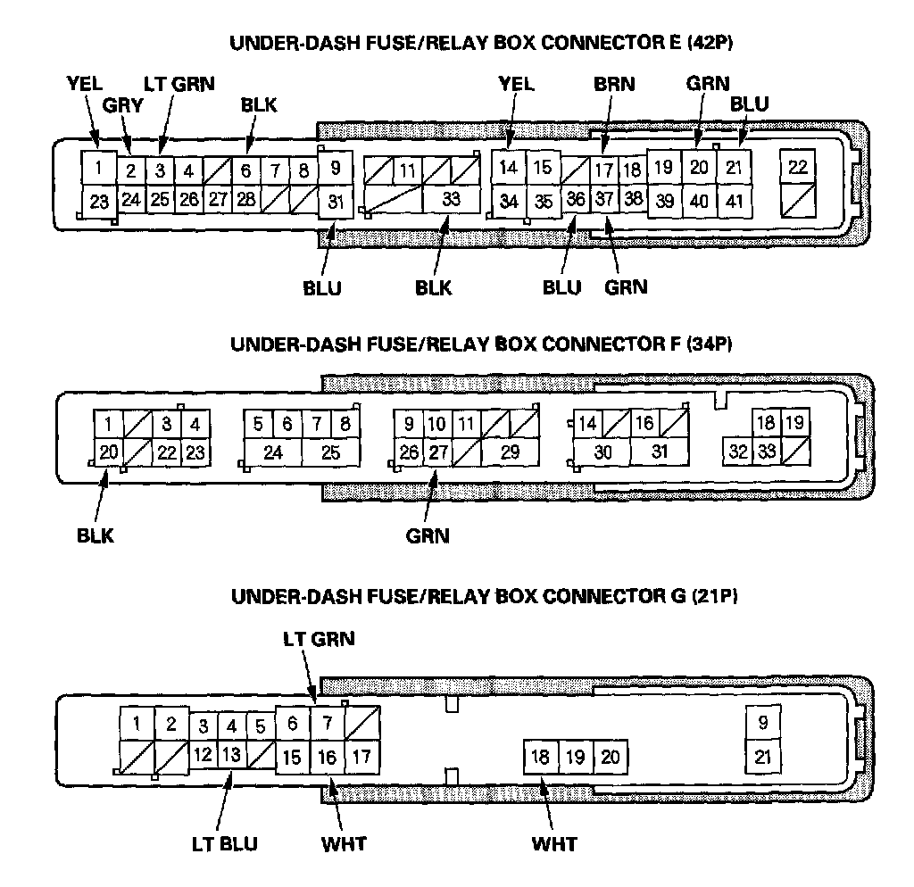 3. Disconnect the under-dash fuse/relay box connectors E, F, G, M, N, Q, R, and T.