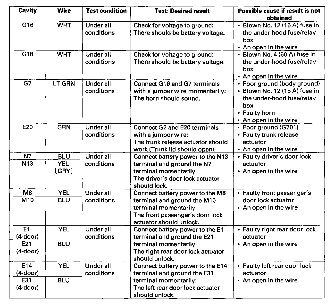 6. Reconnect the connectors to the under-dash fuse/relay box, and make these input tests at the connectors.