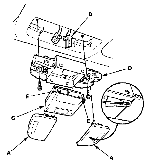 3. Carefully pry off the microphone (C) from the map light housing (D) while pressing in on the retaining tabs(E).
