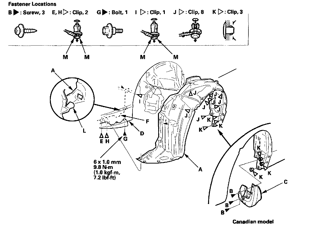 3. From the wheel arch, remove the clips (I, J, K) securing the front inner fender (and splash shield) to the body.