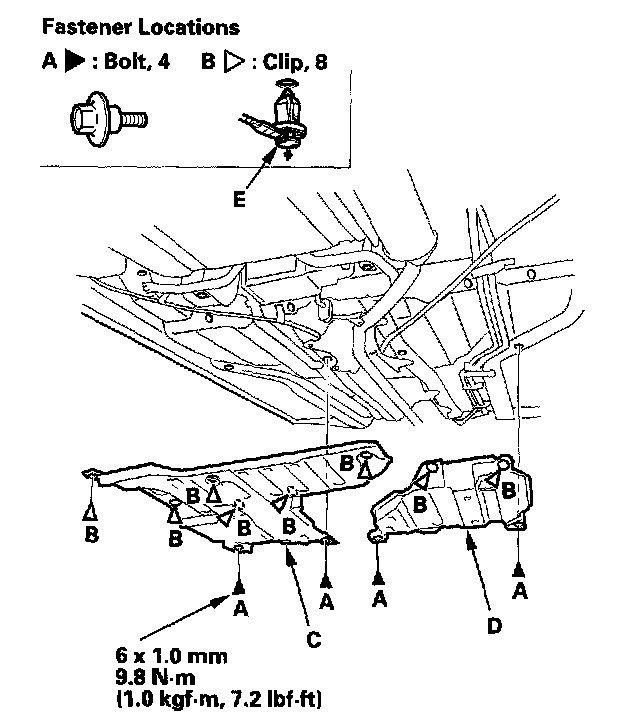 1. Remove the bolts (A), and detach the clips (B), then remove the left middle floor under cover (C) and right middle under cover (D).