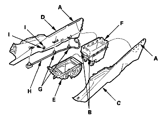4. Release the hooks (A) and pins (B), then separate the left console side panel (C), right console side panel (D), console beverage holder (E) and console box (F). If equipped, detach the harness clips (G), then remove the console subharness (H) from the hooks (I). 4-door is shown; 2-door is similar.