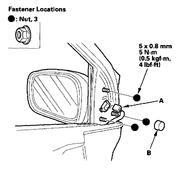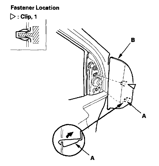 5. While holding the mirror, push in on the connector clip (A), then push out to remove the mirror (B). Take care not to scratch the door.