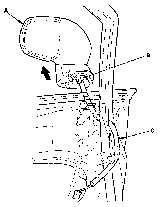5. While holding the mirror (A), detach the clip (B), then remove the mirror, and pull the harness (C) out through the hole in the door. Take care not to scratch the door.