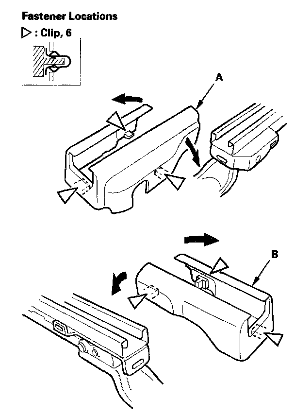 3. Slide the front seat frame forward fully, detach the clips, then remove the left rear rail cover (A) and the right rear rail cover (B) from the back of both seat tracks.