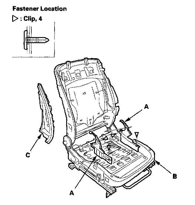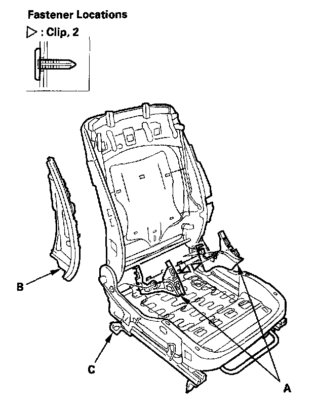 5. Remove the clips, then remove the recline inner covers (A), and the side airbag module holder (B) from the seat frame (C).