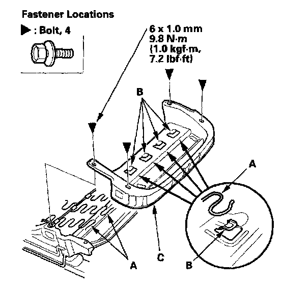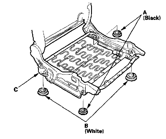 4. Remove the bolts, and release the seat cushion springs (A) from the hooks (B), then remove the seat cushion frame (C).
