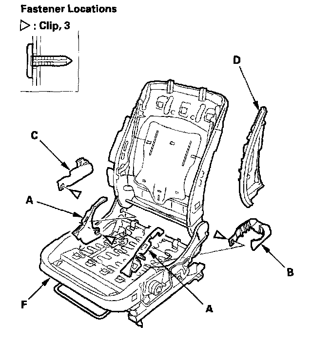3. Remove the clips, then remove the recline inner covers (A), outer upper rail cover (B), inner upper rail cover (C) and the module holder (D) from the seat frame (E).
