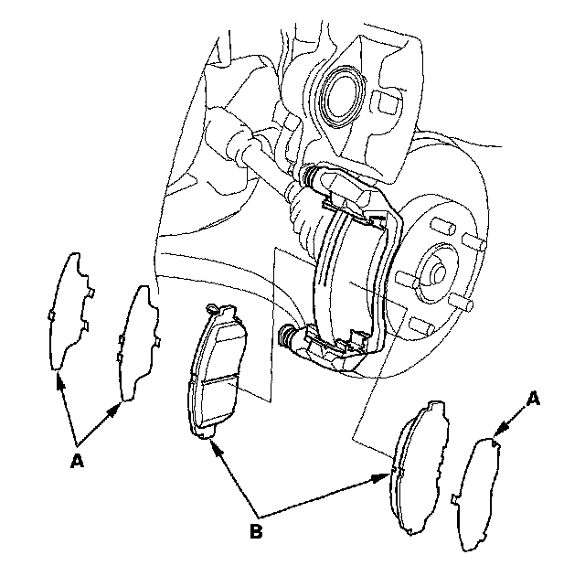 4. Remove the pad shims (A) and brake pads (B).