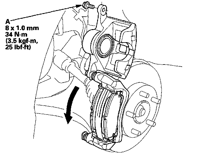 15. Pivot the caliper down into position. Install the flange bolt (A), and tighten it to the specified torque.