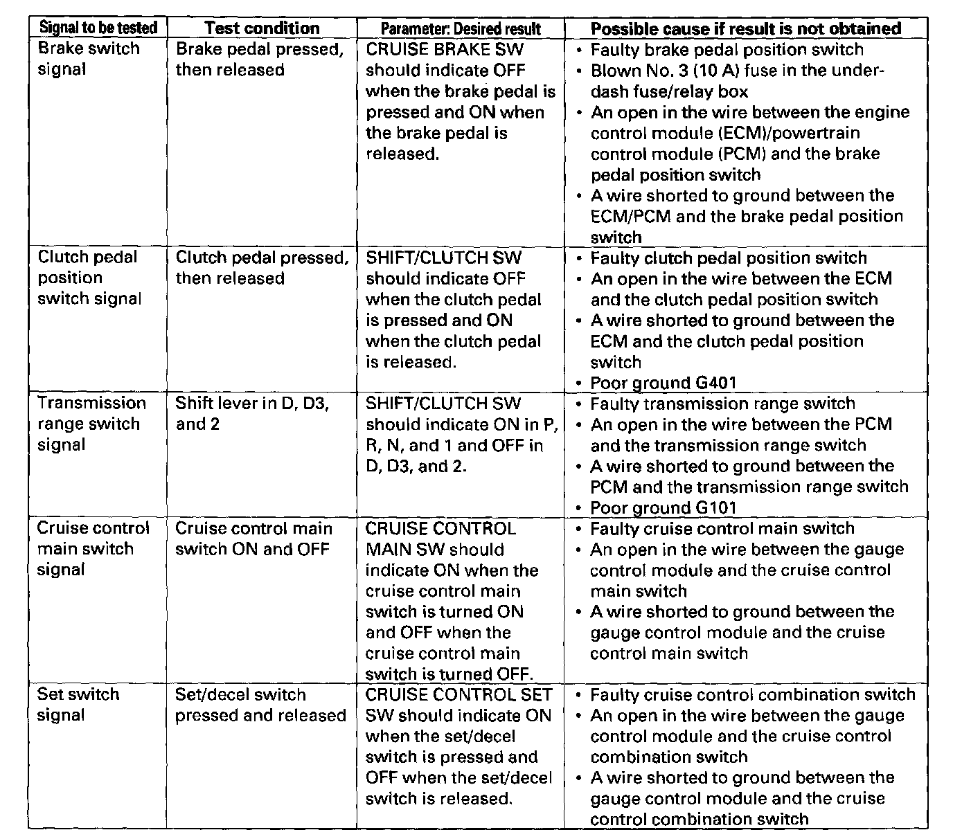 NOTE: Intermittent failures are often caused by loose circuit connections. While monitoring cruise control inputs, flex their circuits, and note if any of the test results change.