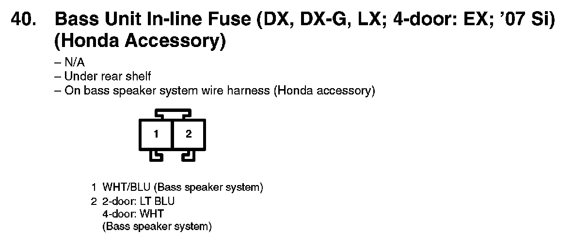 40. Bass Unit In-line Fuse (DX, DX-G, LX; 4-door: EX; '07 Si):