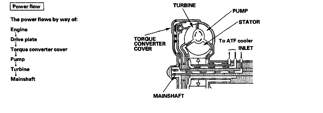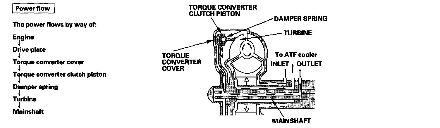 Lock-up SystemThe lock-up mechanism of the torque converter clutch operates in the D position (2nd, 3rd, 4th, and 5th) and D3 position (2nd and 3rd). The pressurized fluid is drained from the back of the torque converter through a fluid passage, causing the torque converter clutch piston to be held against the torque converter cover. As this takes place, the mainshaft rotates at the same speed as the engine crankshaft. Together with the hydraulic control, the PCM optimizes the timing and amount of the lock-up mechanism. When shift solenoid valve D is turned on by the PCM, shift solenoid valve D pressure switches the lock-up shift valve lock-up on and off. The A/T clutch pressure control solenoid valve A and the lock-up control valve control the amount of lock-up.