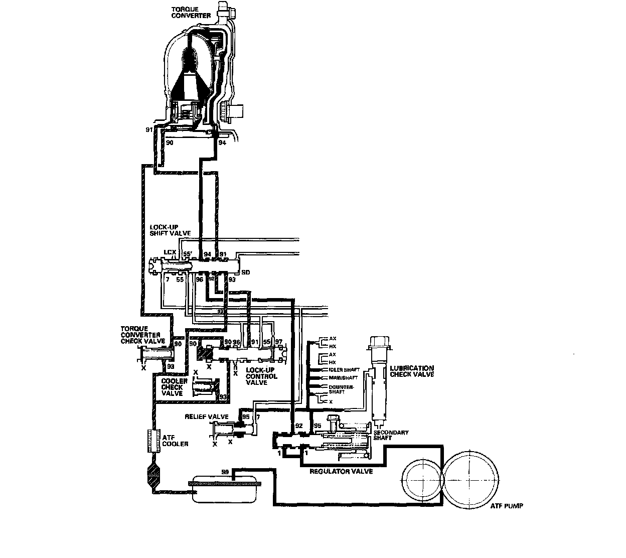 When the vehicle speed further increases, the PCM controls A/T clutch pressure control solenoid valve A to increase A/T clutch pressure control solenoid valve A pressure (55). A/T clutch pressure control solenoid valve A pressure (55) is applied to the lock-up control valve, and the lock-up control valve is moved to the left side to release torque converter back pressure (94). Torque converter pressure (91) enters into the front of the torque converter, and the torque converter clutch piston is engaged with the torque converter cover securely by torque converter pressure. Under this condition, torque converter back pressure is released fully, causing the torque converter clutch to be fully engaged; this condition is full lock-up.
