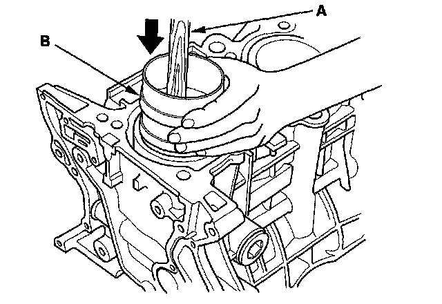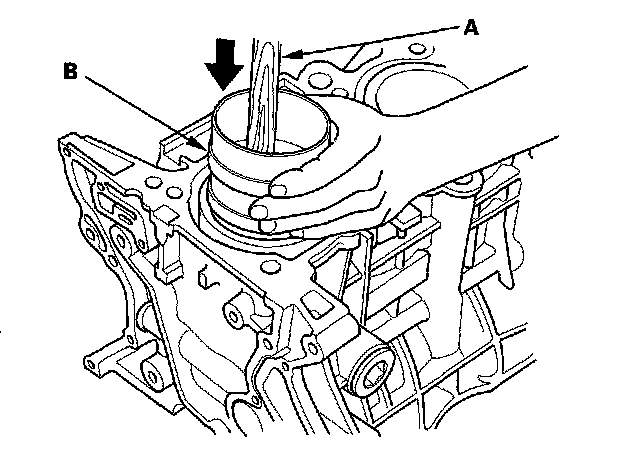 4. Position the piston in the cylinder, and tap it in using the wooden handle of a hammer (A). Push down on the ring compressor (B) to prevent the rings from expanding before entering the cylinder bore.